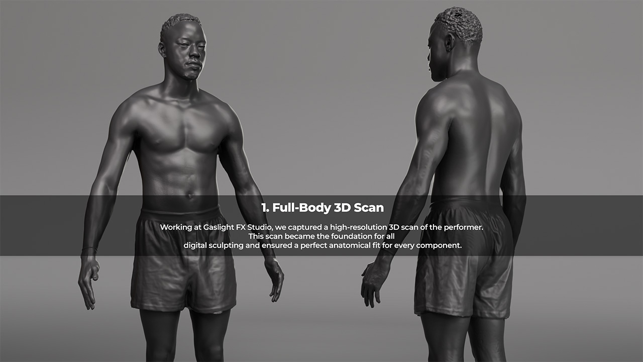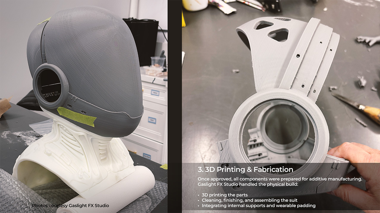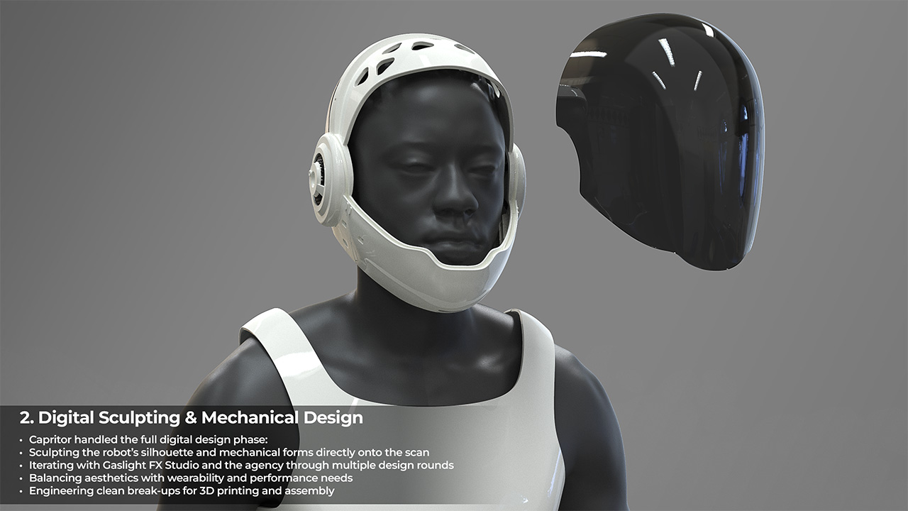 Capritor was brought in as Gaslight FX Studio’s digital department to design the robot from the ground up and leverage 3D scanning and 3D printing to deliver a production‑ready costume without traditional molding or casting.